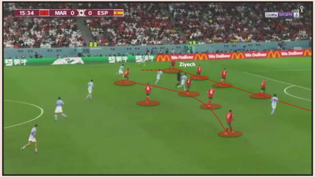 Tiền vệ cánh ở biên gần bóng được yêu cầu lùi lại đường line 4 hậu vệ khi Tây Ban Nha đưa được bóng xuống cuối sân. Morocco vận hành hệ thống 5-4-1 ở khu vực này. Mục đích là có đủ người theo chiều ngang kiểm soát được các đường bóng thả xuống chiều sâu của đối phương ở khu vực hành lang trong.