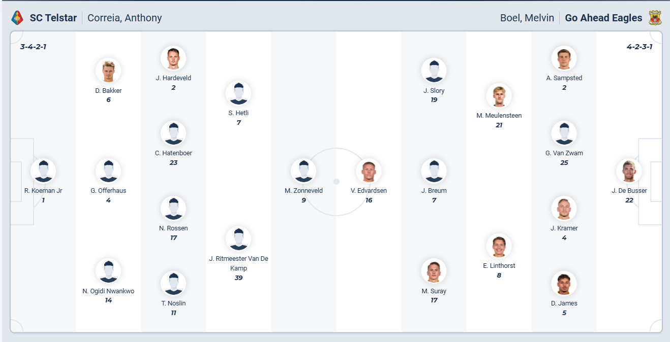 GA Eagles đứng thứ 7 mùa giải trước tại hạng đấu cao nhất của Hà Lan, vị trí rất ổn nếu so với những gì đội bóng của HLV Melvin Boel đang thể hiện mùa này. Họ đang đứng thứ 14 và hơn nhóm xuống hạng 5 điểm, đây là khoảng cách không hề nhỏ với các đội top cuối nên nguy cơ xuống hạng của GA Eagles không cao. Chính vì vậy họ có thể dồn nhiều sức vào đấu trường cup Quốc gia để đi sâu nhất có thể, đến làm khách trên sân của một Telstar không có phong độ tốt là cơ hội để GA Eagles tìm lại niềm vui chiến thắng và khả năng đội khách sẽ có được điều mình cần.