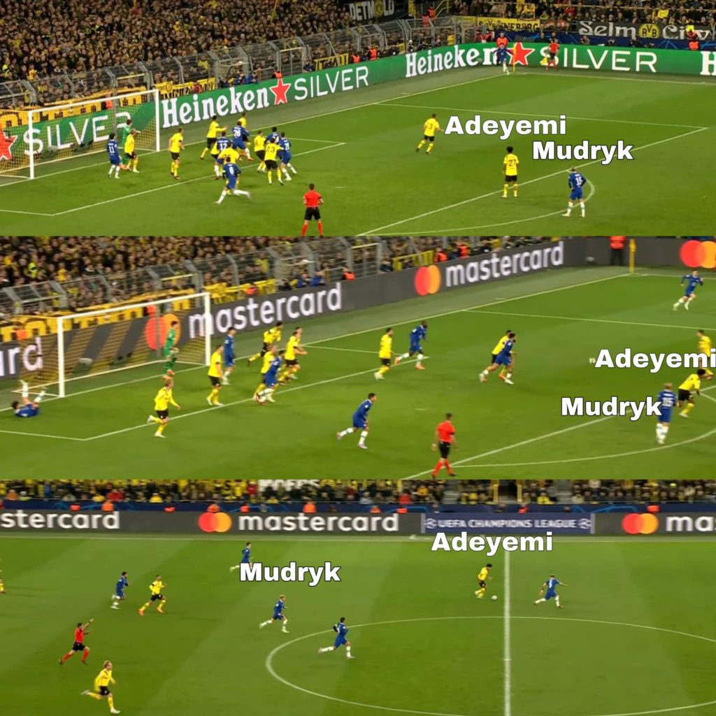 Người thực hiện lần này Ben Chilwell với một quả tạt inswing hướng tới cột xa. Bóng đi cắt ngang khung thành của Kobel trước khi được hậu vệ phía Dortmund phá ra, tìm tới vị trí của Guerreiro. Nếu để ý ở hình thứ hai, Adeyemi đang bắt đầu tăng tốc trước cả khi bóng tìm tới người đàn anh của mình trong khi Mudryk vẫn đang “cưỡi ngựa xem hoa”. Ziyech nhận ra vấn đề và lao vào tranh chấp nhằm ngăn chặn nhưng Guerreiro đã nhanh chân hơn. Adeyemi có bóng trong tình huống 1v1 với Enzo và kết quả thì ai cũng biết.